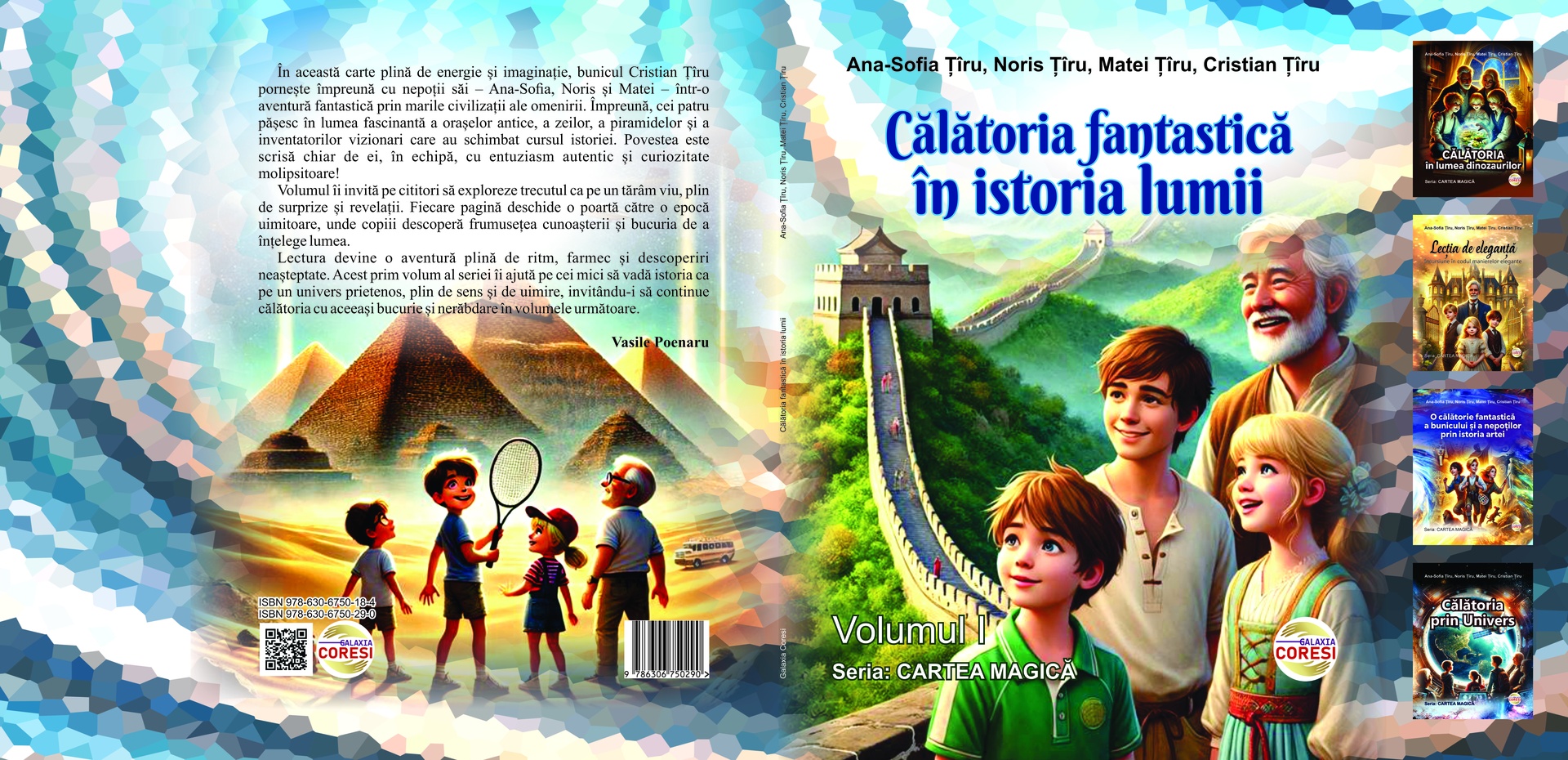 În această carte plină de energie și imaginație, bunicul Cristian Țîru pornește împreună cu nepoții săi – Ana-Sofia, Noris și Matei – într-o aventură fantastică prin marile civilizații ale omenirii. Împreună, cei patru pășesc în lumea fascinantă a orașelor antice, a zeilor, a piramidelor și a inventatorilor vizionari care au schimbat cursul istoriei. Povestea este scrisă chiar de ei, în echipă, cu entuziasm autentic și curiozitate molipsitoare!